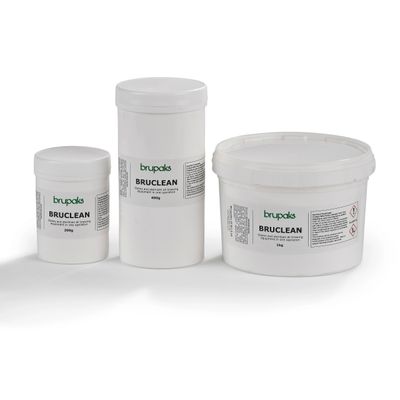 A very powerful cleaner/steriliser which is safe to use on all vessels and equipment, although prolonged contact with metals should be avoided. Bruclean is an alkaline but non caustic based detergent with an available chlorine donor as a sterilant. It does not foam, is readily rinsable and is non corrosive on aluminium. To make up a solution of Bruclean stir 2 teaspoons into 1 gallon of hot or cold water. This dosage can be doubled for heavily soiled items.